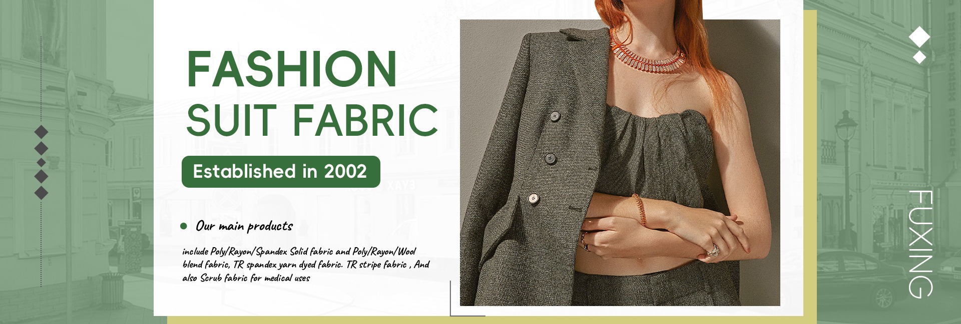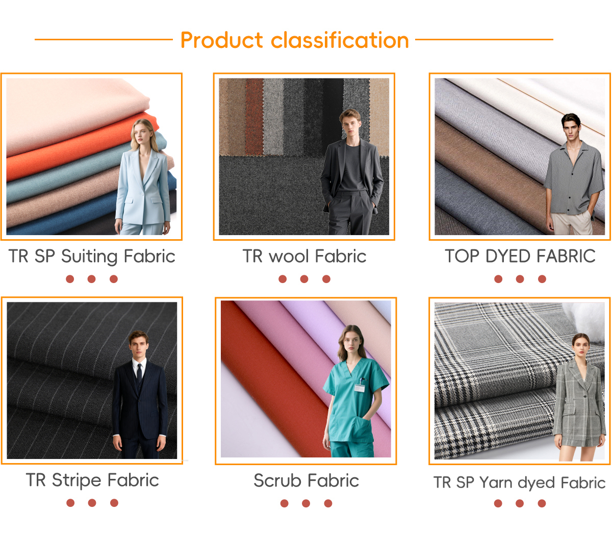 Productos principales:Tela TR, Tela de lana TR, Tela de hilo teñido TR, Tela de impresión de rayón, Tela de algodón SP